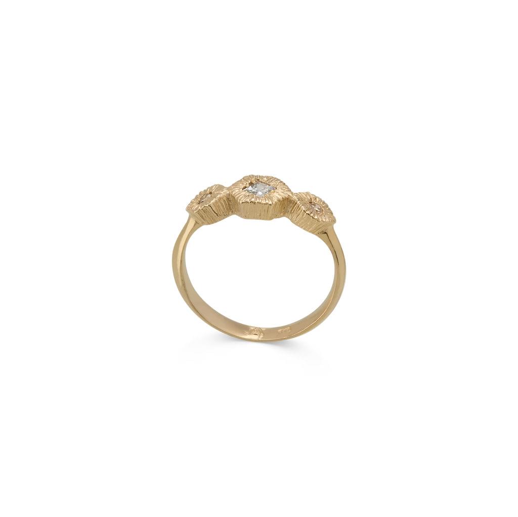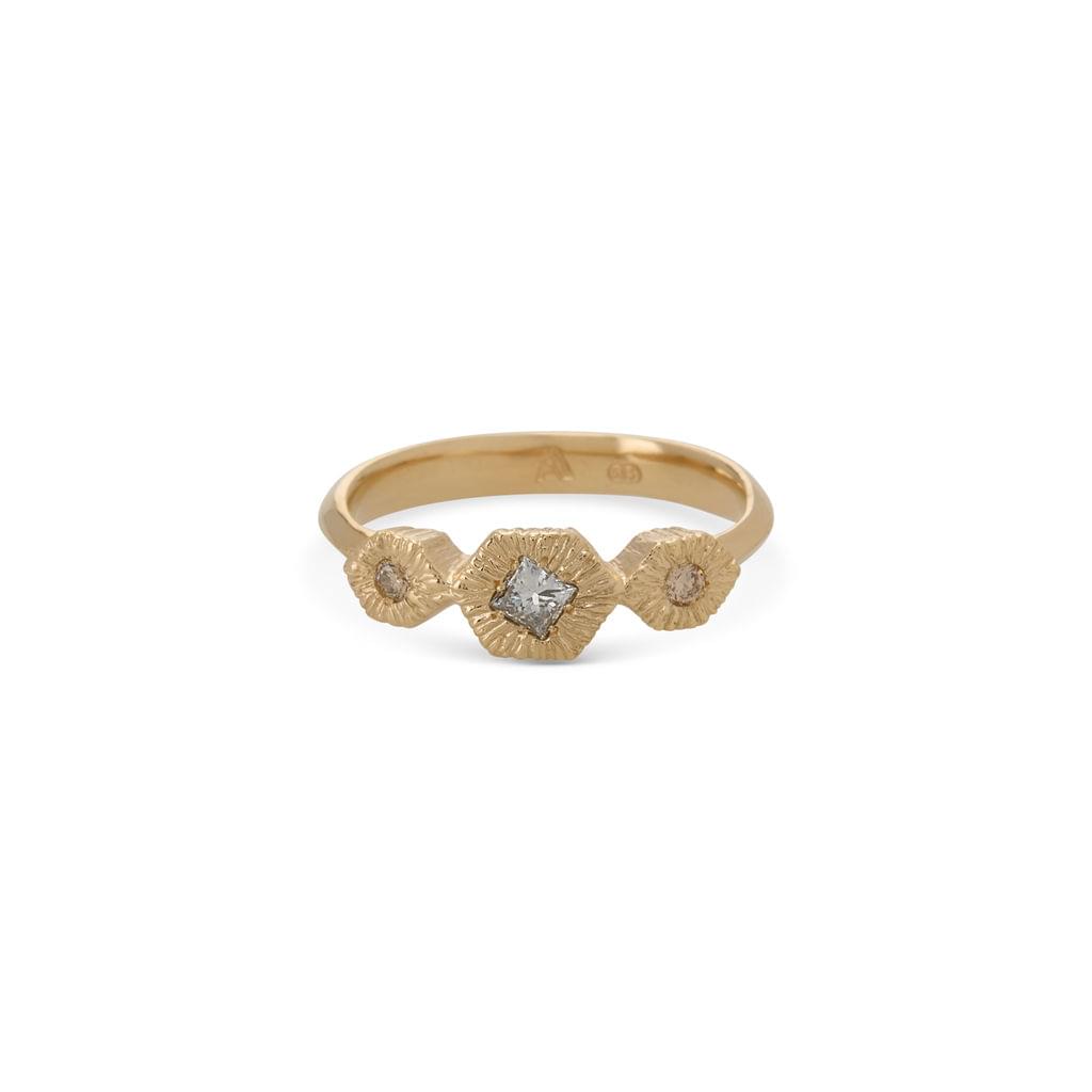 The Theia ring is part of a collection of hand carved gemstone rings. The trio of hexagons with larger central stone form a regal feature on a band with refined details.